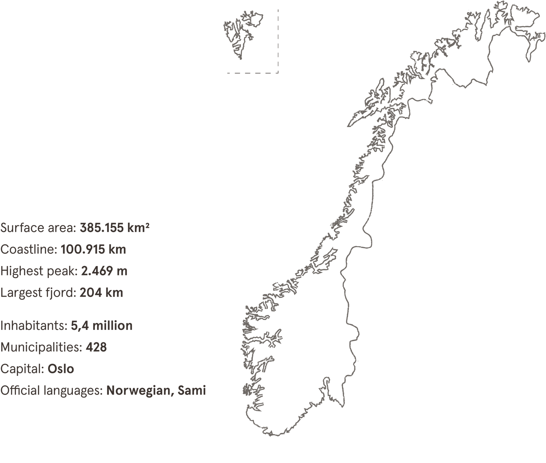 The Kingdom of Norway comprises mainland Norway, the archipelago of Svalbard, and the remote Arctic island of Jan Mayen, totalling a surface area of 384,484 km2 [1]. Mainland Norway’s long and rugged coastline stretches across 100,915 kilometres along the North Sea and is scattered with deep fjords and thousands of islands. Much of the country is dominated by mountains and rocky terrain with subarctic and tundra climates. A vast range of dramatic features have been created by prehistoric glaciers which carved deep grooves into the land. Today, we can see the traces of this in our steep fjords on the west and north coast.
