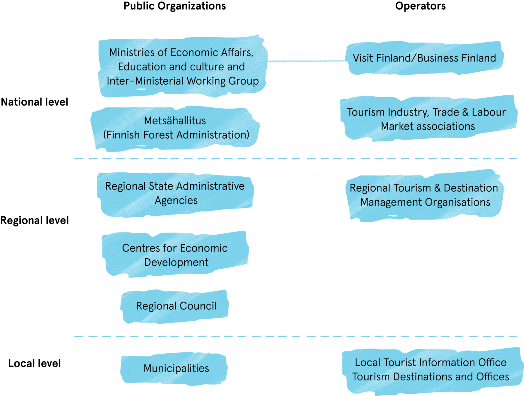 In the Finnish government, nature tourism falls under the governance of the Ministry of Agriculture and Forestry, the Ministry of Economic Affairs and Employment, and the Ministry of the Environment.